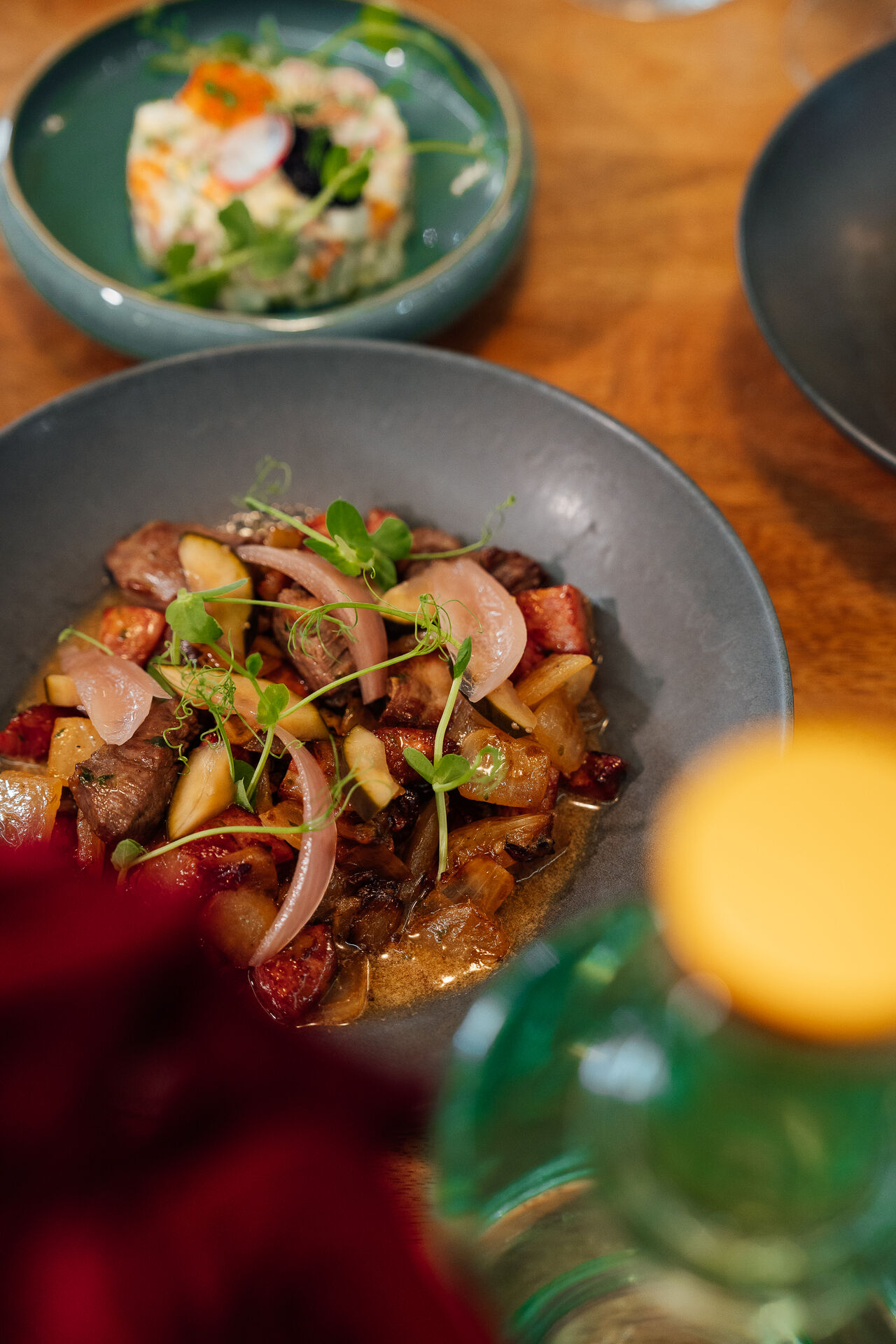 O espaço mistura o charme do design contemporâneo com toques clássicos: lustres discretos, mesas com acabamento em madeira nobre, e uma iluminação suave que convida à conversa e à partilha — experimente as nossas tapas partilhadas e um bom vinho para reunir amigos e família. O atendimento é caloroso, atento e personalizado — fazendo-o sentir-se especial desde o primeiro instante.